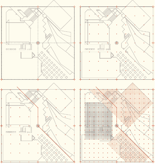 En el diseño del parque de Curridabat (1986) es posible observar un avance sobre las ideas anteriores, principalmente sobre la relación entre la forma geométrica, las partes sueltas y el sitio.29 El lugar disponible para la construcción del parque era una cuadra completa ubicada en el centro de Curridabat, San José, Costa Rica (Figura 3). Como la geometría base estaba dada, Beer usó el cuadrado en planta como origen del proyecto, trazando la estructura modular del cuadrado para comenzar a diseñar.30 También prestó atención a las dinámicas de movimiento del sitio. Un trayecto en particular definió la organización del proyecto. El sistema ortogonal está atravesado por una diagonal que cruza el parque de esquina a esquina (Figura 4). Para entender la importancia de este recurso es necesario apuntar que al costado este del parque está ubicada la parroquia San Antonio de Padua. Para Beer, la posición del parque con respecto de la iglesia significó una oportunidad para usar la geometría como lenguaje cargado de símbolos: “¿Entendés la diagonal? La diagonal implica que no entrás a Dios, no llegás a Dios a través de una línea recta. No es un camino directo.”31