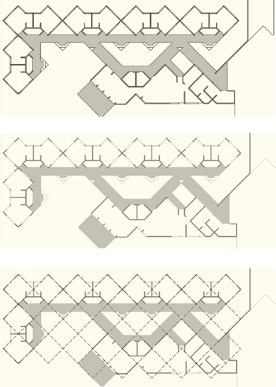 En el Centro Gerontológico, construido en 1987 en Curridabat, San José, Costa Rica, Beer experimentó con la geometría como herramienta. El proyecto impone una estructura geométrica base que reta la figura del sitio. La cuadrícula en esta ocasión se encuentra girada cuarenta y cinco grados con respecto a los linderos del lote. Al giro se le suma el recurso utilizado en la Hotelera Porto Bello: el desarrollo lineal. Nuevamente, el elemento que se repite son las habitaciones en dúplex (Figura 5). Sin embargo, contrario a lo que ocurría en los ejemplos anteriores, en esta ocasión la planta muestra claramente cómo la forma y la distribución de las habitaciones es resultado directo de un trazado geométrico integral. Las dimensiones domésticas no modifican el orden planteado. Podría afirmarse, incluso, que prácticamente cada detalle del Centro fue proyectado con apreciable congruencia geométrica, ya que no existen elementos fuera de la estructura de campo (Figura 6).