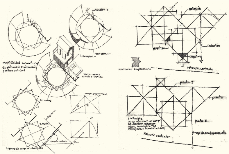 Para poder poner muros, muebles, ventanas, puertas, paredes, necesitás reunir campos tensionales en el espacio, con éstos hacés configuraciones de columnas, de techos, de estructura en general, vigas, tiempo, espacio, movimiento, todos los elementos del espacio. Pero si trato de poner todos en una sola configuración se vuelve un trabajo muy complejo. Entonces uso tres o cuatro elementos que voy a tensar, luego hago otra configuración de tres o cuatro elementos que voy a tensar y lo pongo encima de la anterior. […] Cuando pongo una tercera se empieza a ver complicado porque tengo que sintetizar en la planta cómo todos estos elementos están interactuando. E interactúan de una manera que me habla de una relación entre todas las partes vivas, dinámicas, mutándose y transformando unas a otras.35