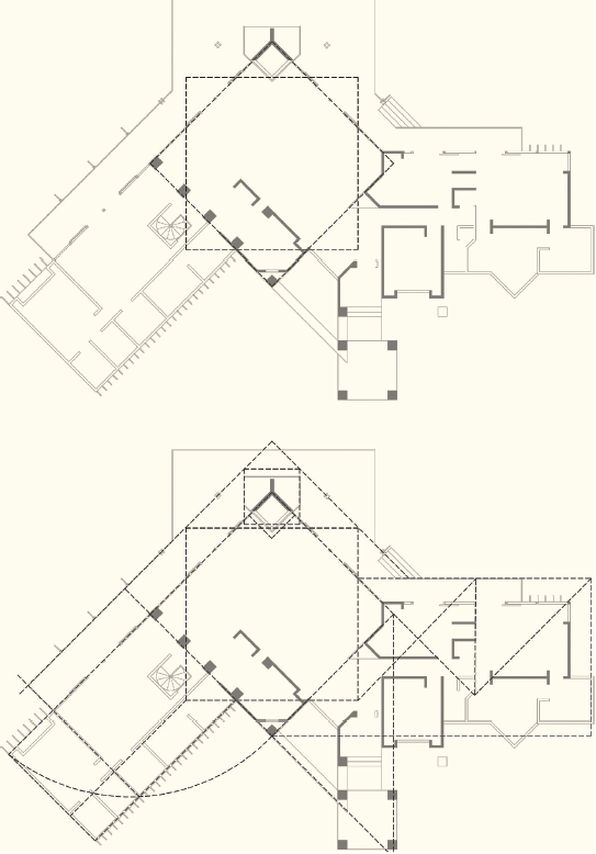 En 1993 se construyó la casa Spinelli, en San José de la Montaña, Heredia, Costa Rica. Beer asegura que ésta le ofreció la oportunidad de explorar plenamente sus inquietudes a partir de algunos principios derivados de la Teoría del Campo de Atillio Marcolli, un texto con el que había trabajado en el Flux.33 Afirma que la pauta del proyecto era generar un cambio espacial, y con este propósito definió la estructura geométrica base de la casa. La forma del lote en este caso no representaba una limitante formal, pues sus dimensiones admitían la independencia formal del objeto arquitectónico. En línea con proyectos anteriores, partió de un cuadrado girado cuarenta y cinco grados. Luego, sobre el centro de este cuadrado rotó otro cuadrado de igual tamaño cuarenta y cinco grados. Esta es la pauta con la que inició el diseño de la casa Spinelli (Figura 7). Decidió que este trazado sería el espacio principal de la casa, y al interior de los cuadrados ubicó las áreas comunes -sala de estar y comedor-. A partir de los lados, vértices e intersecciones de los cuadrados, proyectó las formas geométricas que organizan el resto de la casa (Figura 8).