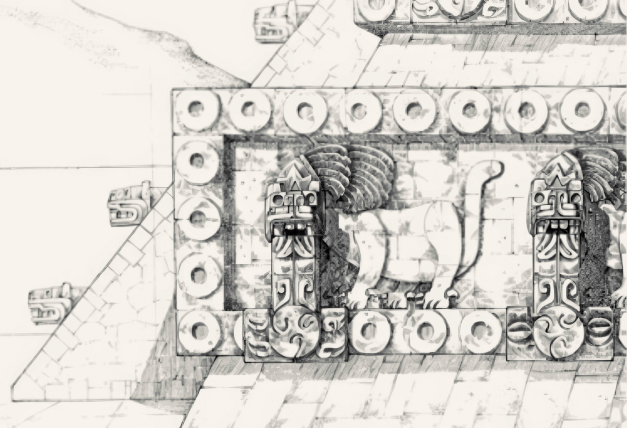Fig. 3 Pirámide del Sol, plataforma adosada central. Reconstrucción hipotética de programa escultórico. Dibujo de Víctor Álvarez y Alejandro Sarabia González, 2017.
