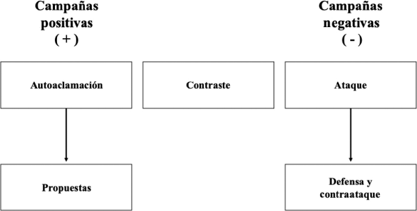 La Figura 1 muestra el sentido estratégico de los mensajes en una campaña electoral, como se puede ver, hay muchos tipos de publicidad negativa que se usa en función de estas campañas y en contextos específicos, empero existe un tipo de comunicación que no se reduce a los clásicos ataques directos entre partidos y candidatos, sino que son piezas publicitarias basadas en la mentira y la denuncia. Entre otros rasgos que caracterizan a una campaña negativa destacan la claridad del argumento, una interpretación forzada de las virtudes de los contendientes y la utilización de empleo de medias verdades. Además, los datos duros suelen ser reemplazados por estímulos emocionales, son campañas altamente visuales e identifican escenarios políticos dominados por una pugna entre héroes y villanos, lo cual despierta pasiones, temores y esperanzas, al convertir el proceso de elección de autoridades, en un show mediático (García-Beaudoux y D’Adamo, 2013).