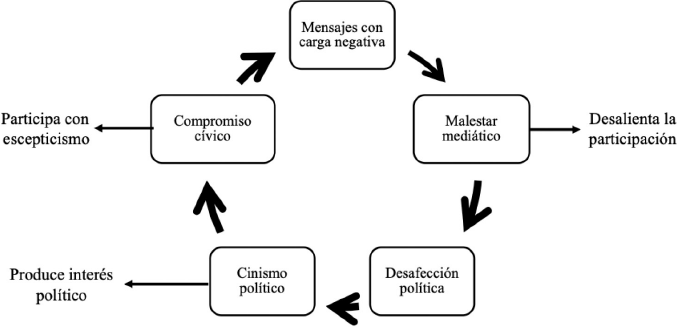 Diversos autores identifican una relación entre malestar y una ausencia de participación política (Hotlz-Bacha, 1990), en tanto que otras posturas sugieren que las actitudes negativas respecto del sistema político podrían, por el contrario, movilizar a los ciudadanos, pero mediante canales informales de participación política (Austin y Pinkleton, 1995). Independientemente de la diferencia de perspectivas, las interpretaciones y explicaciones coinciden en que el desencanto público con el proceso político se debe, en parte, al proceso de comunicación política (Norris, 2001). Una de las explicaciones más recurrentes sobre la ausencia de compromiso cívico se encuentra en la teoría del malestar mediático (Robinson, 1976) utilizada en los años sesenta para referirse a la publicación de una serie de artículos a raíz del escándalo del Watergate, y de la relación entre periodismo y política. Norris (2001) explica: