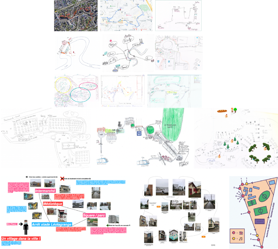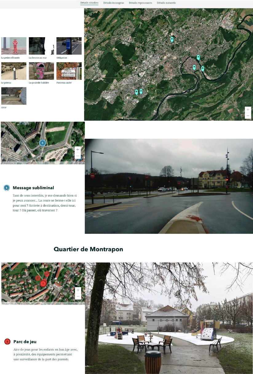 L’étude faite par Evelise Millet et Anne Griffond-Boitier concernait d’autres types d’espace que ceux impliqués initialement dans notre approche des espaces verts, notamment en périphérie de la ville où le végétal est peu valorisé. Retravaillant par groupes les différents thèmes émergeants, les étudiants ont défini des thèmes, et ont réalisé des storymaps3 qui ont servi à rendre compte de l’ensemble des “histoires” vécues par les différents enquêtés. Ils ont ainsi produit plusieurs storymaps imbriquées les unes dans les autres : les quartiers explorés; les cartes mentales ; les sons de la ville ; mobilité.s en centre-ville et en banlieue de Besançon; les détails de Besançon (les points de vue ; le vivant et le non-vivant dans la ville) ; l’esprit des lieux ; entre intimité et clôture (sensation de fermeture). Il y a eu une mise en carte des récits ou des récits utilisant les cartes géographiques (Figure 2).