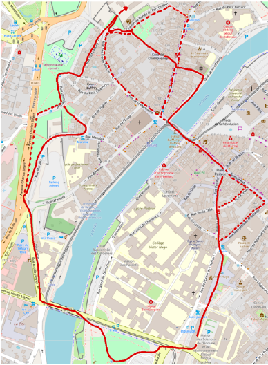 Nous relatons ici ce projet car cela concerne directement le sujet des méthodes visuelles et aussi parce que cela apporte un double point de vue sur un même objet. Evelise Millet (2021) a demandé à des étudiants de 3ème année de licence de géographie (encadrés par Anne Griffond-Boitier) d’effectuer des parcours dans différents lieux de Besançon - avec point de départ et point d’arrivée et répartition la plus exhaustive possible des rues arpentées. L’objectif était de porter attention au territoire dans une optique de “care”, autrement dit de “prendre soin du territoire” (concept adapté au territoire et à l’espace par le géographe Michel Lussault, 2021).