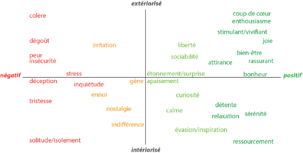 D’un point de vue sémantique, nous avons beaucoup réfléchi quant au terme à employer car dans la littérature le vocabulaire sur le sujet est très riche : il est question d’affects, d’émotions, de ressentis, de perceptions… Au final, c’est le concept de ressenti que nous conservons, parce qu’il correspond bien à nos objectifs. Si la géographie humaine a montré un intérêt pour les ressentis dans le paysage (cf. les travaux de Di Méo ou E. Bailly), elle l’a peu fait directement sur les espaces verts et leur importance en milieu urbain. “Alors qu’il est désormais relativement simple d’utiliser ces outils [de storymap] pour représenter les différents lieux associés à des récits […], il devient plus compliqué de cartographier les émotions, les perceptions, les peurs et les joies ressentis durant ces trajets” (Caquard, Dimitrovas, 2017). Comment, alors, mesurer ces ressentis ? et comment prendre en compte des ressentis opposés (Nowlis, Nowlis, 1956) ? Mieux vaut éviter d’utiliser les grilles classiques comportant une trop grande dichotomie. Les échelles d’affects actuellement utilisées (Izard, 1972 ; Mc-Nair, Lorr, Droppleman, 1971 ; Nowlis, Nowlis, 1956 ; Thayer, 1967) laissent volontairement place à l’ambiguïté, permettant ainsi de ne pas avoir à choisir entre deux opposés. D’où notre idée de proposer aux enquêtés un schéma comportant deux axes (Figure 5) : négatifs/positifs et intériorisé/extériorisé, et de les laisser se placer aux intersections correspondant à ce qu’ils ressentent.