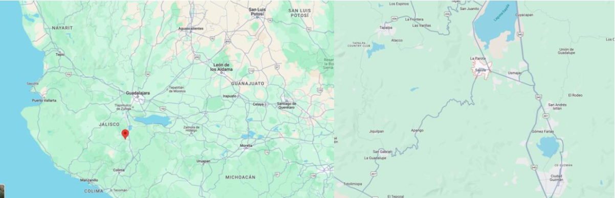 Imagen 3 Mapa de la izquierda; región correspondiente al Estado de Jalisco. Mapa de la derecha; acercamiento a la región de nacimiento de Juan Rulfo (Sayula, San Gabriel y Ciudad Guzmán)