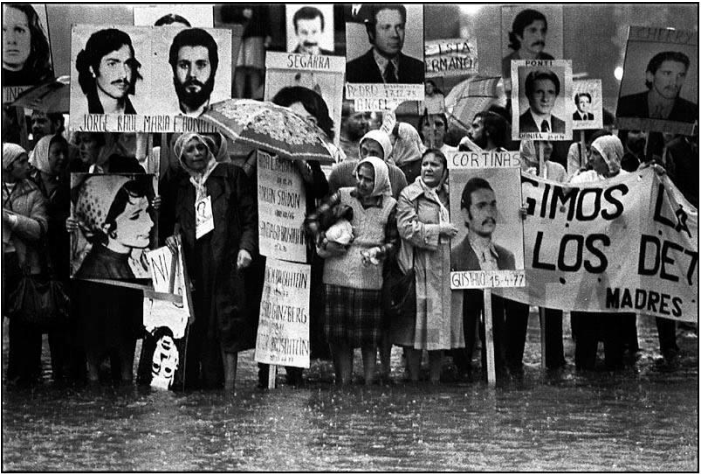 Videla utilizó las tácticas del régimen escópico para camuflar el secuestro, la tortura y el asesinato de miles de personas. En su conocida declaración televisiva,2 afirmó que las personas desaparecidas no podían tener un tratamiento especial, eran incógnitas, no tenían entidad, “no están ni muertos, ni vivos”; alegaba que solo si aparecieran se podría proceder desde la oficialidad. Bajo estas condiciones de terrorismo de Estado, surge la asociación de las Madres de la Plaza de Mayo en 1977 para recuperar con vida a los detenidos por la dictadura militar e identificar a los responsables de los crímenes con la finalidad de llevarlos frente a la justicia.