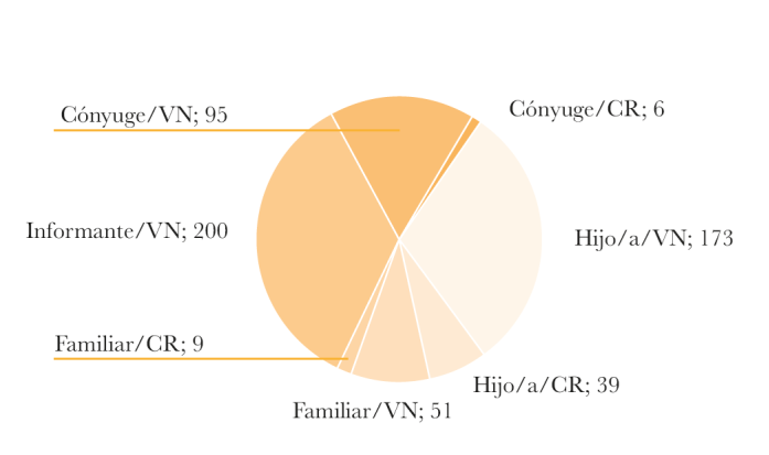En San José, Costa Rica, se entrevistaron a 200 personas migrantes venezolanas quienes, después de identificar a los integrantes de su familia, dieron un total de 626 personas, incluyendo al informante. Como puede observarse en la Gráfica 1, el 90% tiene un parentesco de tipo nuclear (34% informante, 17% cónyuge y 37% hijo/a) y solo el 10% tiene una relación de parentesco de tipo ampliada o compuesta (padre, hermano, sobrino, tío y/o abuelo, entre otros). Además, aunque la mayoría de los familiares declarados son personas nacidas en Venezuela, el 9% nació en Costa Rica, cuya relación de parentesco es cónyuge, hijo u otro familiar como cuñado, nieto y suegro (1, 7 y 1%, respectivamente); estos indicadores permiten mostrar la transición o conformación de familias binacionales en las ciudades latinoamericanas de destino, como San José. En estas familias venezolanas-costarricenses sería interesante indagar experiencias diferenciadas en el acceso a la educación, atención médica o al trabajo ante la diada nacional-extranjero de cada integrante de la familia.