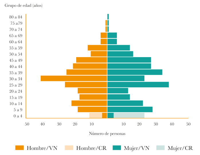 Un indicador sociodemográfico representativo de la etapa de vida en la que se encuentran las personas, en este caso aquellas vinculadas a procesos migratorios, es la distribución de la población por grupo etario y sexo. Como se puede observar en la pirámide poblacional (Gráfica 2), la estructura poblacional de la comunidad migrante venezolana en Costa Rica refiere a una población con un perfil diverso, compuesto por menores de edad, personas en edad laboral y adultas mayores, una estructura alejada de un perfil migratorio-laboral (que usualmente prevalece) y consistente con procesos migratorios generalizados y producto de un amplio tiempo de exposición a la emigración. Desde el país de llegada, esta diversidad etaria permite aproximarse a las necesidades de la comunidad migrante de arribo, diferenciando entre edad y sexo, como podrían ser necesidades educativas, laborales y de salud. Es de destacar que sobresale una alta proporción de niñas y niños de edades de 0-4 años nacidos en Costa Rica, con una mayor prevalencia entre las mujeres que en los varones (85 y 73%, niñas y niños costarricenses, respectivamente).