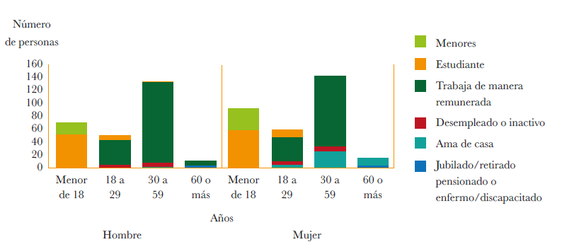 En la vida cotidiana, la mayoría de las niñas, niños y adolescentes venezolanos asisten a la escuela, y no hay registros de menores de edad incorporados al mercado laboral costarricense. En la Gráfica 3 puede verse que la actividad central de la población joven es el trabajo remunerado y que casi todos los varones se encontraban trabajando (91%), mientras que solo el 69% de las mujeres lo estaban. Es de destacar que entre los jóvenes venezolanos de 18 a 29 años aún existen personas que declaran ser estudiantes, tanto entre las mujeres como en los varones. En contraste con la principal actividad de los varones, una parte importante de las mujeres venezolanas se desempeñan como amas de casa, mostrando la prevalencia de roles de género tradicionales.
