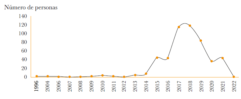 Con base en la población venezolana registrada en LAMP-ENIR 2021, el migrante más antiguo arribó a Costa Rica en 1996 y solo el 5% de los entrevistados llegaron entre dicho año y 2014. El año 2015 es icónico en la inmigración venezolana a Costa Rica, pues marcó el inicio del flujo de venezolanos al país. Como se observa en la Gráfica 4, el punto más alto de la inmigración venezolana ocurrió entre 2017 y 2018 cuando llegó el 45% de todas las personas entrevistadas. El periodo entre 2019 y 2022, a pesar de mostrar una tendencia a la baja en la inmigración, representa un tercio de las llegadas de venezolanos a territorio costarricense; es preciso señalar que dicho decremento en la inmigración no significa una disminución en el tránsito de venezolanos por el país, el cual continuaba de manera persistente. El patrón migratorio venezolano observado en Costa Rica coincide con las tendencias internacionales de dicho flujo migratorio a otros países latinoamericanos.