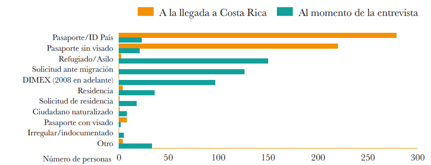 Una ventaja de LAMP-ENIR 2021 es la recopilación de la experiencia migratoria en el tiempo. Un ejemplo de ello es la condición migratoria de las personas al llegar a un país y al cabo de un tiempo, hasta el momento de la entrevista. La hipótesis más común al respecto es que una persona experimenta cambios en la situación migratoria de una condición irregular a una regular con el paso del tiempo. Como se muestra en la Gráfica 5, la mayoría de las personas venezolanas residentes entrevistadas en territorio costarricense señalaron haber llegado al país de manera regular, con documentos como un pasaporte de turista o un pasaporte sin el visado correspondiente; sin embargo, una vez que el tiempo transcurre, la condición migratoria se modifica en diversas direcciones, hacia solicitudes de refugio o asilo, peticiones de residencia, adscripciones en programas únicos o excepcionales de permisos de residencia temporal. Sin embargo, es preciso decir que algunas personas continúan su estancia en el país con un pasaporte de turista e incluso transitan hacia una situación migratoria irregular o indocumentada al culminar la validez de un documento migratorio previo.