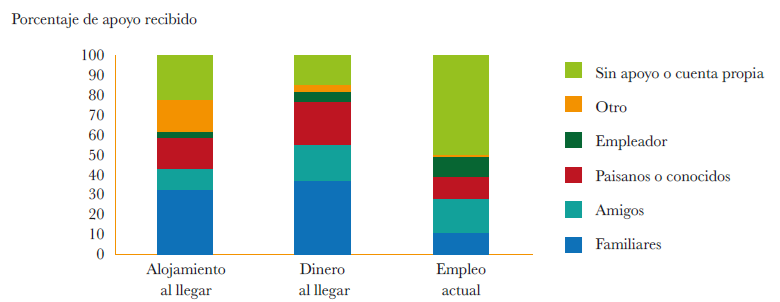 A pesar de que LAMP-ENIR 2021 refiere a formas de búsqueda de trabajo que son excluyentes entre sí, otros trabajos han mostrado que las personas migrantes en las ciudades de destino activan diversas y combinadas formas de búsqueda de empleo (Nájera, 2022). Las redes sociolaborales recaen esencialmente en personas de la misma comunidad migrante venezolana (78%), seguido de personas nacionales-costarricenses (17%) y por último en personas migrantes de otros países de origen.