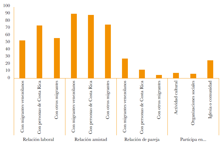 La interacción sociocultural entre personas migrantes y población local no solo ocurre a través de los vínculos o redes sociales, sino también de la participación de las personas en actividades culturales, en organizaciones sociales y en espacios comunitarios o religiosos. Aunque dichas formas de interacción social tienen una menor prevalencia que las redes sociales laborales, de amistad y de pareja, destaca la participación religiosa o en la comunidad como una importante forma de socialización local. Un hallazgo adicional es que existe un mayor porcentaje de migrantes con relaciones sociales y de participación local en Costa Rica entre los migrantes venezolanos que llevan más años residiendo en el país, en comparación con los migrantes de reciente llegada; este aspecto permite apoyar la hipótesis de que a mayor tiempo de estancia en un país, mayor inclusión sociocultural.