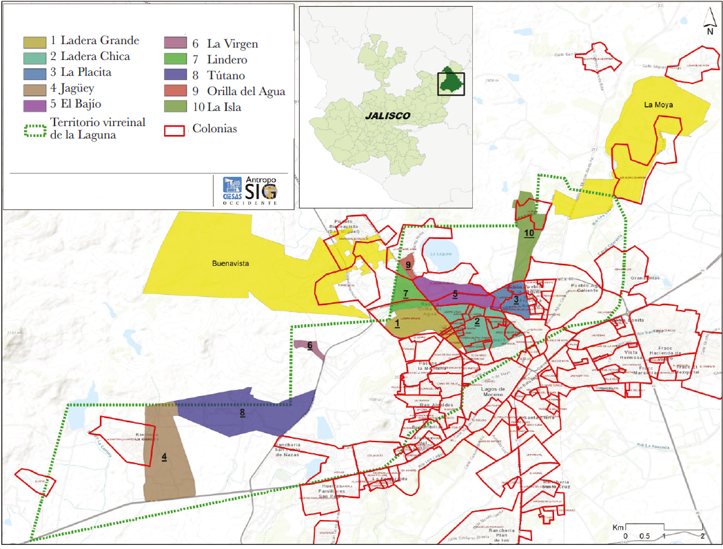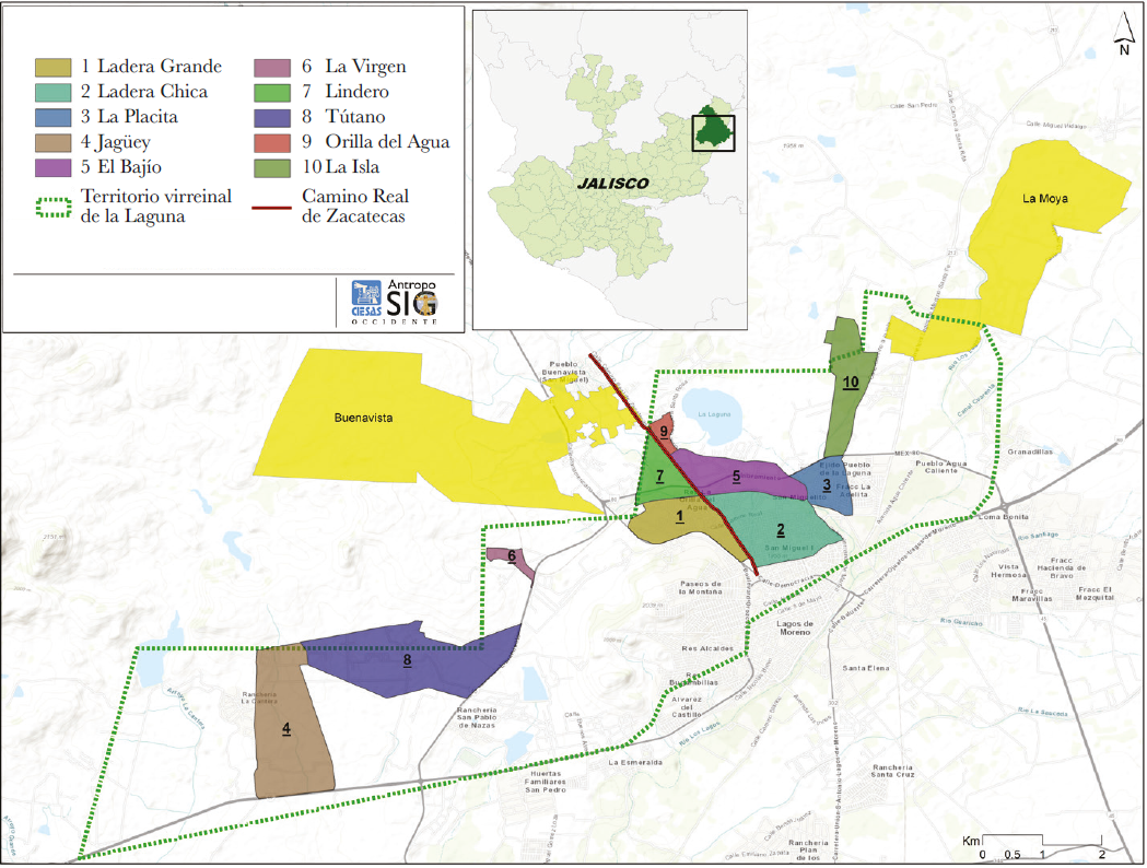 El Instituto de Información Estadística y Geografía (IIEG) ha calculado, en un estudio del etnoterritorio y cartografía social, que el pueblo de La Laguna llegó a comprender una extensión de 4 847 hectáreas.18 Estas tierras ahora se han convertido en pequeñas propiedades y recientemente La Laguna ha sido dividida en colonias de la ciudad de Lagos de Moreno, esquema territorial que se sobrepone al sistema tradicional en el que el pueblo de San Juan de la Laguna se piensa a sí mismo como un espacio de interacción sociocultural entre los diez barrios que lo componen y que se encuentran distribuidos en todo el territorio que adquirieron por mercedes y compras durante el periodo virreinal. Lo mismo puede decirse para el caso de Buenavista y Moya. A su vez, los tres pueblos constituyen una unidad, a partir de su pasado común, sus tradiciones e importantes vínculos de parentesco.
