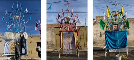 Otros dicen que las seis banderas y la cruz central representan “los siete dolores de la virgen” (Gómez Alonzo, s.f.: 11). Finalmente, a un lado de las horquillas, al interior de la estructura, colocan de manera horizontal dos travesaños paralelos que servirán para formar las andas con las que llevarán el arco sobre los hombros. Cabe mencionar que, en ocasiones, algunas piezas de madera o carrizo son remplazadas por otras de metal, que resultan más estables y duraderas, pero la forma del arco no cambia.