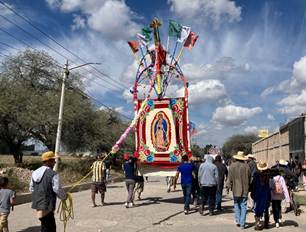 Según nuestras creencias, eso fue lo que pidió la santísima virgen cuando llegó aquí, a la comunidad del pueblo de San Miguel Buenavista. El que la trajo, eso fue lo que les explicó a los antepasados. Les dijo que ella quería ser recibida con arcos, con banda, danza,11 música y bastante gente. Fue cuando se hizo la invitación a todos los barrios, pa’ que hubiera gente. Ahorita, sin mentirle, usted mirará y se dará cuenta el día de mañana que, aproximadamente, unas dos mil personas vienen en la peregrinación haciendo unos quinientos metros de larga la peregrinación [calcula la extensión del contingente] (Buenavista, 23 de enero de 2024).