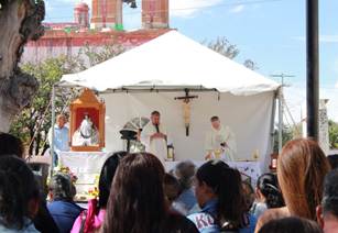 Tras pasar por el altar, cada uno de los arcos tomó su lugar en el perímetro de la plaza. Para esto, siguen el mismo orden del recorrido y que corresponde a los turnos para marchar de vuelta a casa. Cada grupo sabía muy bien cuál era el sitio que le correspondía. Enseguida inició la misa que oficiaron el párroco de La Laguna y su auxiliar. Esta concluyó con una bendición para todas las familias de los pueblos: “A estas familias tan necesitadas de la bendición de Dios” y “desintegradas e incompletas por los desaparecidos”. No hay espacio para ahondar en esto, pero es bien sabida la situación de violencia que les aqueja. Posteriormente, el párroco tomó en sus manos la imagen de la virgen y la llevó al lugar en donde se encontraba cada uno de los arcos. Ahí colocaba la estatuilla por encima de su cabeza y las agrupaciones hacían una reverencia. Con esto concluyó la participación de los sacerdotes.