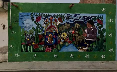 Ilustración 9 Mural comunitario que revindica el origen indígena de la gente de La Laguna a través de la Fiesta de los Arcos con la frase: “Por el espíritu de nuestros ancestros, por la magia de los colores y por la sangre que nos une en tradición”.