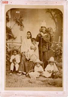 En ese sentido, al contrastar las fotografías identificadas visualmente con sus descripciones escritas, se encuentran coincidencias entre la información que traían escrita las propias fotos y lo que el catálogo consigna, pero también se detectaron diferencias o matices. La información que los remitentes de las fotos querían dar a conocer podía diferir de lo que la Junta Colombina buscaba enfatizar. Destaca un registro grupal proveniente del territorio de Tepic que se presenta en el catálogo como una “familia de la raza indígena que habita en las ciudades” (véase Imagen 3). La imagen deja ver una familia compuesta por el padre, quien lleva puesto el uniforme del ejército federal y sostiene una bayoneta, la madre que carga a uno de sus hijos en el regazo y tres niños sentados a ambos lados de ella, todos mirando al frente. En su descripción, Del Paso aclara que “el remitente cree que presenta caracteres de haberse mezclado con otras razas”, pero que “el aspecto de los individuos es de raza indígena casi pura” (Catálogo de México, 1893: 256-257). El comentario deja ver que Del Paso hacía correcciones cuando consideraba que la información con la que llegaban las fotos enviadas no era atinada. Lo interesante es que, por lo general, explicitaba el error que corregía o al menos indicaba que haría una modificación.