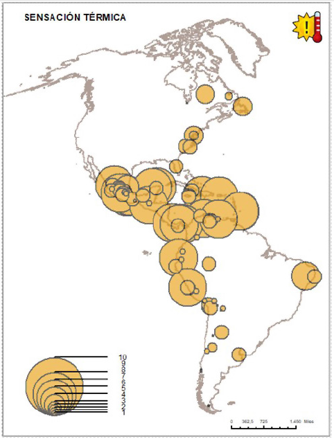 Figura 1 Sensación térmica y valores asignados a la categoría. Datos localizados en el mapa de América según las fuentes documentales históricas (cualitativas).