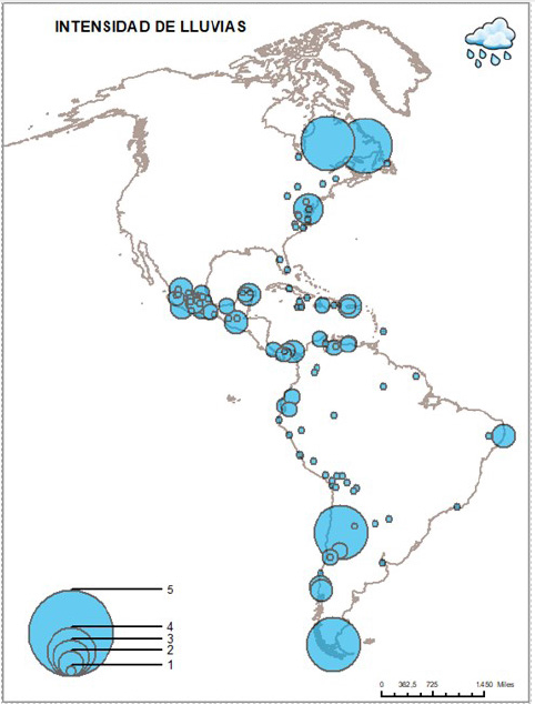 Figura 2 Intensidad de lluvias y valores asignados a la categoría. Datos localizados en el mapa de América según las fuentes documentales históricas (cualitativas).
