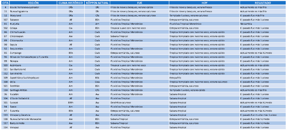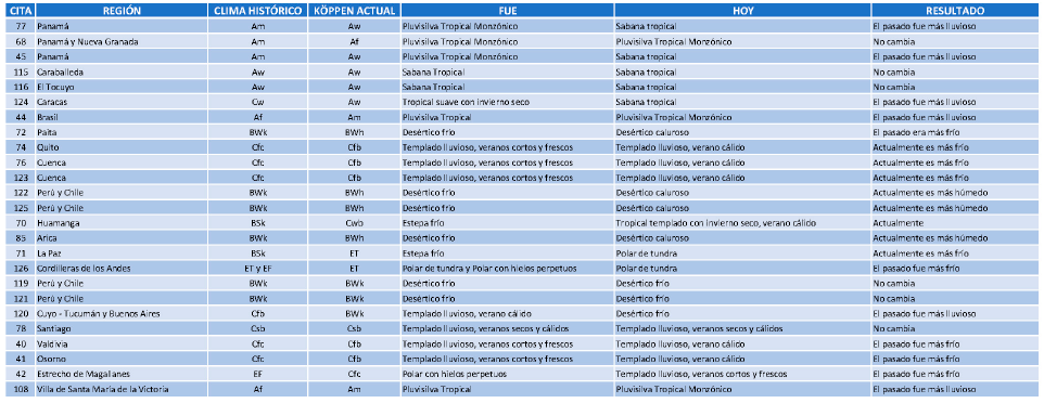 Definidas las categorías climáticas de Köppen en cada región de América, según los datos recopilados de la documentación histórica a la que se accedió, se procedió a la comparación de los climas de los siglos xvi-xvii con la actual clasificación climática de Köppen-Geiger del continente americano. Los datos climáticos del siglo xxi se obtuvieron a partir del estudio titulado “World Map of the Köppen-Geiger climate classification updated”, publicado en 2006 y escrito por integrantes del Biometeorology Group de la University of Veterinary Medicine Vienna de Austria y de la Global Precipitation Climatology Centre de Alemania.57 Dicho análisis se proporcionó por medio del nivel (categoría) de la clasificación Köppen-Geiger entre los rangos de: Mantiene, Sube y Baja dependiente del cambio de gran categoría para obtener si en el pasado fue más frio, cálido, húmedo o lluvioso. De este modo, la tabla comparativa de la clasificación climática de Köppen-Geiger se basa en los siglos estudiados y cuyo valor se representa en la actualidad (véase Anexo: Tabla de análisis final).