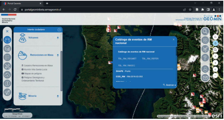 En SERNAGEOMIN, el Visor Portal Geomin es el catálogo nacional de información geológica y minera. Esta herramienta incluye las ubicaciones de referencia de numerosas publicaciones, así como el catastro nacional de RM que se limita exclusivamente a los informes de asistencias técnicas realizadas por funcionarios del servicio. Es importante destacar que este registro no es fotointerpretativo, no muestra los inventarios mencionados y no refleja la totalidad de remociones en el territorio. Es importante tener en cuenta que el Visor Portal Geomin, como su nombre lo indica, está diseñado principalmente para la visualización y no permite la descarga de archivos en formato vectorial.