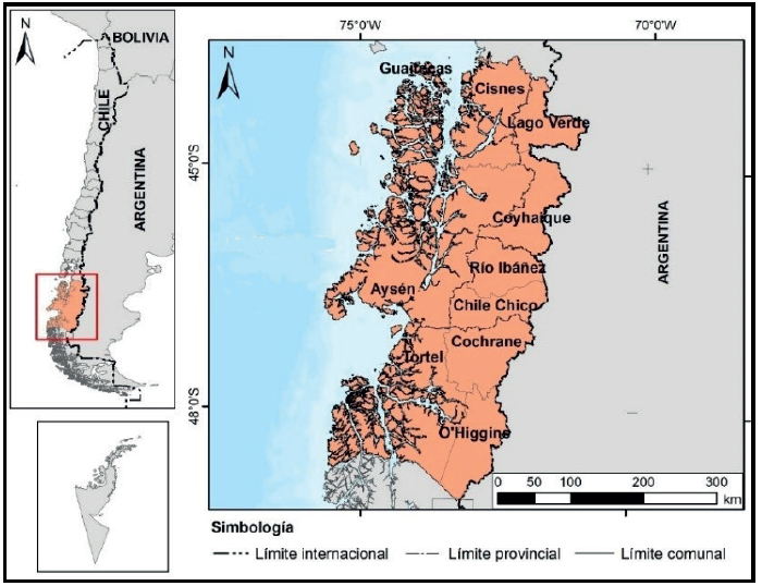 Como contexto de aplicación de la propuesta de BBDD se considera los registros de RM de la región de Aysén del General Carlos Ibáñez del Campo. Esta región (Figura 2) presenta una vasta extensión, 108.494,40 km2 (Biblioteca Nacional, 2005), cuenta con una población total de 103.158 habitantes (Instituto Nacional de Estadística [INE], 2017), por lo que la densidad poblacional es bastante menor comparado con otras regiones del país. Sumado al hecho de que Coyhaique, la capital regional, alberga a más de la mitad de esa población 57.818 habitantes (INE, 2019).