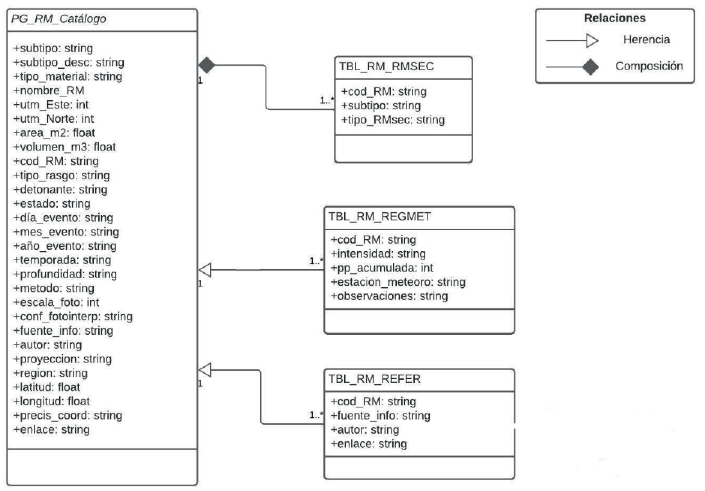 La relación de herencia establece que las tablas secundarias o subclases asociadas a la superclase, en este caso PG_RM_Catálogo, heredan todos los atributos de esta última, evitando así la duplicidad de información. Por otro lado, la relación de composición establece que no puede existir una subclase sin la superclase, lo cual se ve reflejado para las remociones secundarias.