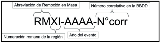 Para el código de identificación del registro (COD_RM) se propone un formato que considere los aspectos más generales del evento, que tenga una estructura lógica y que a su vez sea lo suficientemente específico para poder realizar búsquedas por filtros de manera rápida y sencilla. En la Figura 4 se presenta la propuesta de codificación para el campo COD_RM que incluye las siglas ‘RM’ que indican ‘Remoción en Masa’, seguidas del número de la región en numeración romana, un guion medio para separar el tercer elemento que representa el año del evento de la Remoción en Masa, y otro guion medio que finaliza con el número correlativo de ingreso a la Base de Datos. Esta estructura permite abarcar los aspectos más generales sin repetir información ya incluida en otros campos de la BBDD.