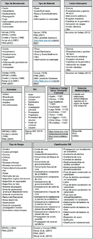 Se han definido 10 listas de dominio para los campos de la propuesta de la base de datos. Estas listas abarcan: Tipo de Movimiento, Tipo de Material, Factor Detonante, Actividad, Rol, Comuna, Código Único Territorial, Estación Meteorológica, Tipo de Rasgo y Clasificación de RM. Se proporciona un resumen de estas listas y sus fuentes en la Figura 5.