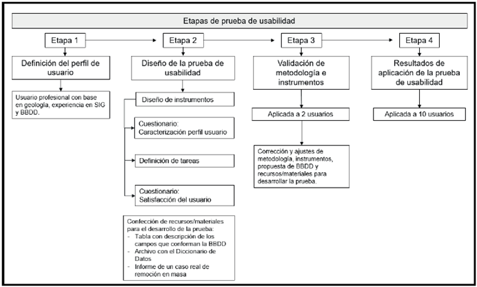 La prueba de usabilidad se desarrolló en cuatro etapas, las cuales se esquematizan en la Figura 6. A cada participante de la prueba se asignó un código único a cada usuario con el fin de garantizar la trazabilidad de sus acciones a lo largo de los resultados obtenidos en la aplicación de los distintos instrumentos definidos para la prueba de usabilidad.