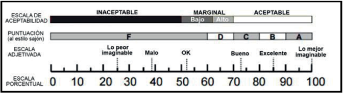 Figura 7 Escalas de calificaciones de puntaje SUS. Fuente: Bargor, Kortum & Miller (2009, citado en Brooke, 2013).