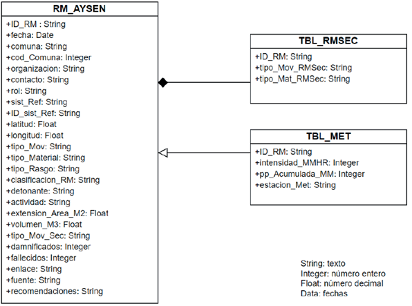 Todas las subclases mantienen una cardinalidad 1…* con la superclase, es decir, un evento de RM puede tener muchos datos o ninguno en las tablas relacionadas. Por ejemplo, un evento de RM puede tener varias remociones secundarias asociadas o ninguna, desde cero a varios datos de precipitaciones dependiendo de las estaciones que registren y/o una o varias fuentes de la información que acrediten el evento.