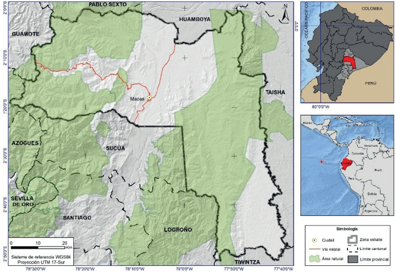 La ciudad de Macas es la capital cantonal y provincial, ubicada geográficamente a 2° 17’ 54.94” de latitud sur y 78° 09’ 59.03” de longitud oeste (Carrera et al., 2021; Palacios & Arellano, 2022). Se conecta hacia el resto del país mediante la vía estatal E-45 hacia el norte-sur, y la vía E-46 hacia la parte central del Ecuador; de estos ejes viales, el último ha presentado históricamente problemas debido a movimientos de tierra que han generado reiterados cierres viables y pérdidas humanas (Palacios & Toulkeridis, 2020). Además, la ampliación de la frontera agrícola y el cambio de cobertura del suelo es una problemática en todo el cantón (Palacios & Arellano, 2021), lo cual propende un escenario poco alentador ante esta amenaza natural que podría afectar directa o indirectamente a sus 61479 habitantes (INEC, 2023) . En la Figura 1 se muestra el área de estudio.