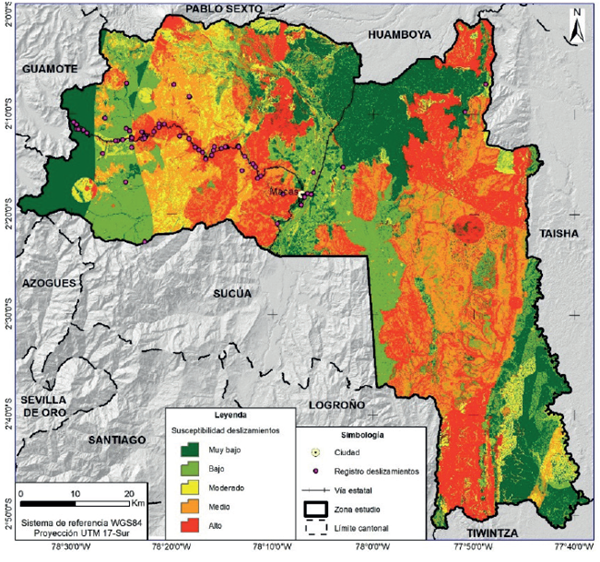 Además, en el caso específico de Macas se identificó que la superficie con la mayor susceptibilidad se ubica precisamente en la zona con menor densidad poblacional (suelo rural), lo cual refleja la realidad del territorio; contrariamente a lo que sucede en los asentamientos humanos de Zúñac y Alshi donde las zonas pobladas están limitadas e incluso intersecadas con áreas susceptibles a deslizamientos (Figura 3), y por ende mantienen un riesgo latente ante esta amenaza natural.