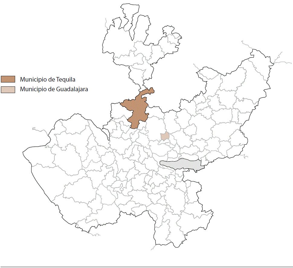 La investigación se centra principalmente en el municipio de Tequila, lugar que le dio nombre a la bebida. Esto de acuerdo con González, quien opina que «la gente no podrá conocer su territorio, pero el nombre de la bebida ya ha ganado su lugar en el imaginario mundial» (2008: 328). Ahora bien, no se debe soslayar que la producción de tequila se ha extendido a otros municipios de la región Valles y de Los Altos de Jalisco, así como de otras regiones e incluso otros estados. De hecho en 2019 en el municipio estudiado se produjeron 64 millones de litros de tequila, que representan 18 % del total (CRT, 2020b), y la empresa José Cuervo produce más tequila en la localidad de La Laja, municipio de Zapotlanejo, que en Tequila.4
