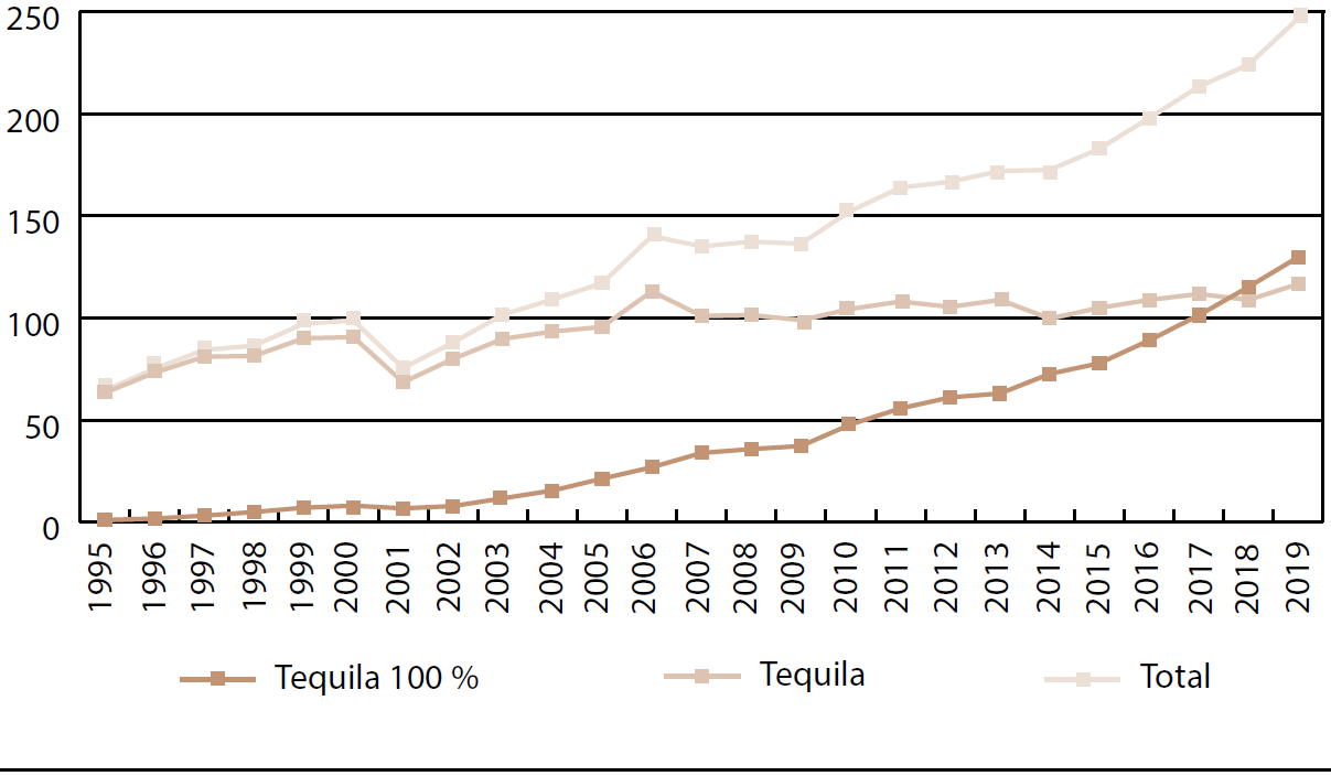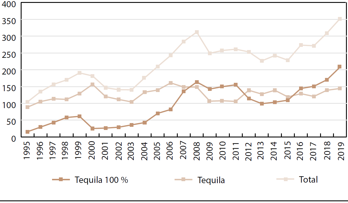 Con estas medidas, además de que se ha tratado de proteger a la industria del tequila, se ha posicionado como una bebida que cuida su calidad y utiliza «tecnología de punta en lo que se refiere a los procesos administrativos y productivos» (Hernández, 2010: 155), si se compara su proceso de elaboración con el de bebidas como el mezcal y el bacanora (Puga, González y Negrete, 2012; Salazar, Moreno y Casas, 2015). Con lo anterior, el incremento en su venta en México desde 1986 y la firma de varios tratados comerciales bilaterales, ha aumentado la producción y exportación de tequila.11 En la Gráfica 1 se observa que en 1995 la producción de tequila fue de 104.3 millones de litros, y que se produjo más de este tequila que de tequila 100 %. En 2019 la producción alcanzó los 351.7 millones de litros, pero fue mayor la producción de tequila 100 %. En 24 años la industria tuvo un crecimiento de 237 %.