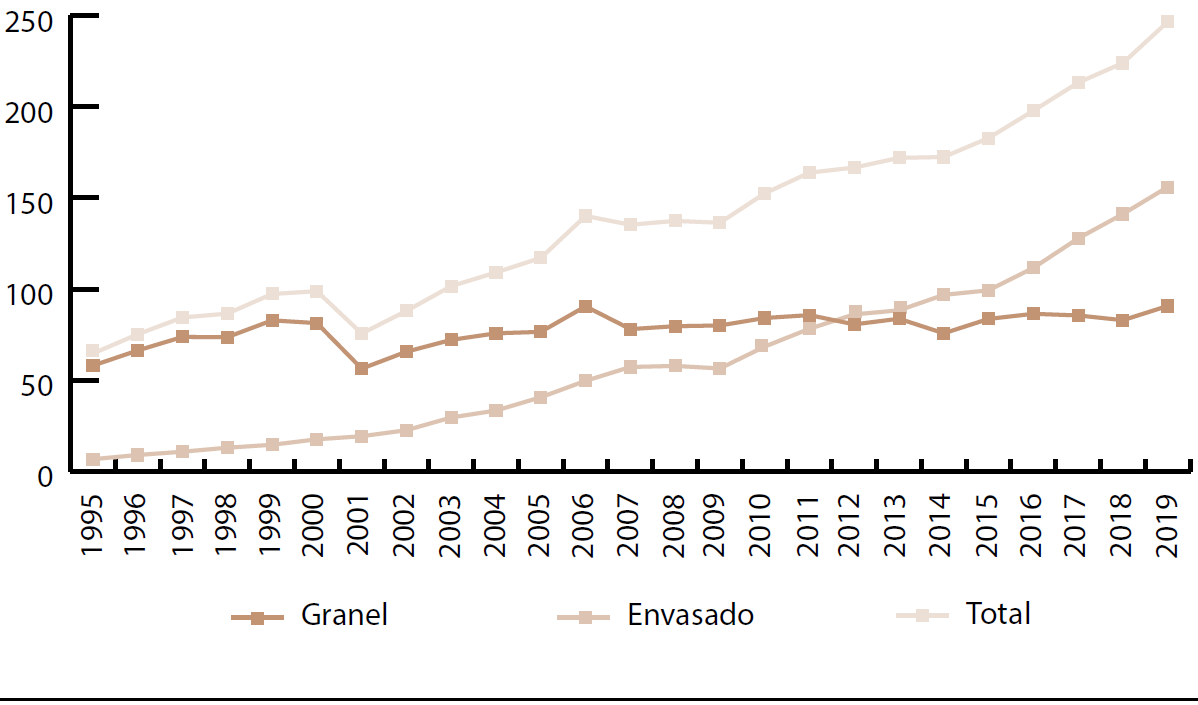 En la Gráfica 3 se observa el dato interesante de que también ha aumentado la exportación de tequila envasado, pues en 2019 se exportaron 156 millones de litros de la bebida en esa forma, mientras que solo se exportaron 90.7 millones de litros a granel. Este era uno de los principales reclamos que se hacían a la industria, pues se corría el riesgo de que lo que se envasaba en el exterior pudiera ser adulterado, con las consecuencias que ello implica, como lo señalan Castillo, Coelho y Ayala (2005: 27).