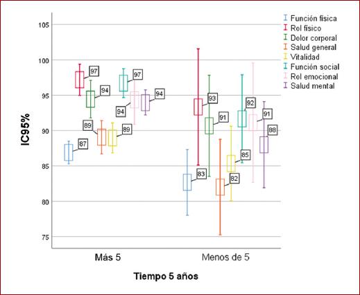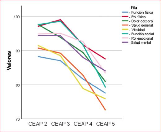 Edad en promedio 54 ± 14 años, el 69.1% de los casos del sexo femenino. Dentro de los antecedentes de importancia, en el grupo de más de cinco años con el filtro se identificó hipertensión arterial sistémica en el 47.70 vs. 28.3%, diabetes mellitus en el 26.7 vs. 22.6% y tabaquismo en el 22.6 vs. 13.3%. Se encontró un porcentaje importante de trombofilias en estos pacientes, un 28.3% en el grupo de más de cinco años con el filtro con predominio de síndrome antifosfolípido (SAF), mientras que en el grupo de menos de cinco años el 20% con predominio en la alteración en factor V de Leiden fue la más común. Respecto a las indicaciones para la colocación, en primer lugar de frecuencia las indicaciones absolutas en el 45.6%, seguido de indicaciones relativas en un 44.1% y tercer lugar las indicación profilácticas (pacientes sin trombosis venosa profunda [TVP]) en un 10.3%. Al comparar los casos según el tiempo de evolución y la calidad de vida, se identificó que los pacientes con una evolución menor a cinco años presentaron una evaluación porcentual SF-36 más baja (menor calidad de vida) en las esferas de función física (83 vs. 87%; p = 0.029), salud general (82 vs. 89%; p = 0.013), función social (91.7 vs. 96.7%; p = 0.044) y salud mental como la esfera con más marcada diferencia con 83 vs. 87% de percepción de calidad de salud (p = 0.009) (Fig. 1). Finalmente, en la escala de CEAP se identificó una distribución similar de las evaluaciones SF-36 con una tendencia a la disminución cuanto más grave fue la puntuación CEAP, siendo más afectada la esfera de salud general con 91 ± 7 vs. 89 ± 8 vs. 83 ± 4 y 73 ± 18 con una disminución paulatina de la calidad de vida SF-36 respectivamente según la puntuación CEAP de 2 a 5 puntos (p < 0.0001) (Fig. 2). Solo se identificaron complicaciones severas en dos pacientes, uno con translocación del filtro y uno más con trombosis de vena cava inferior, ambos pertenecientes al grupo de más de cinco años. Ambos pacientes fueron intervenidos. En el primer paciente se realizó un retiro abierto y cierre primario de VCI, debido a que la totalidad de las puntas del filtro se encontraban exteriorizadas, cursando con buena evolución. El segundo paciente fue sometido a flebografía y trombólisis farmacomecánica acelerada por ultrasonido (EKOS) logrando repermeabilizar el segmento iliocavo, también con una buena evolución y sin datos de síndrome postrombótico al momento.
