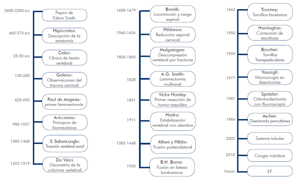 El periodo Egipcio nos ayudó a comprender la anatomía y en el periodo Griego y Bizantino los signos y síntomas de los padecimientos espinales. Fue en el periodo Arábico / Islámico cuando surgieron nuevos instrumentos y técnicas quirúrgicas. Durante el Renacimiento se establecieron los conceptos de la biomecánica, así como la redacción de obras maestras en la literatura médica. Sin embargo, fue en la edad moderna cuando hubo una evolución importante tras el establecimiento de la técnica anestésica y la antisepsia, con un repunte considerable del desarrollo de la cirugía de columna vertebral en los últimos 100 años.