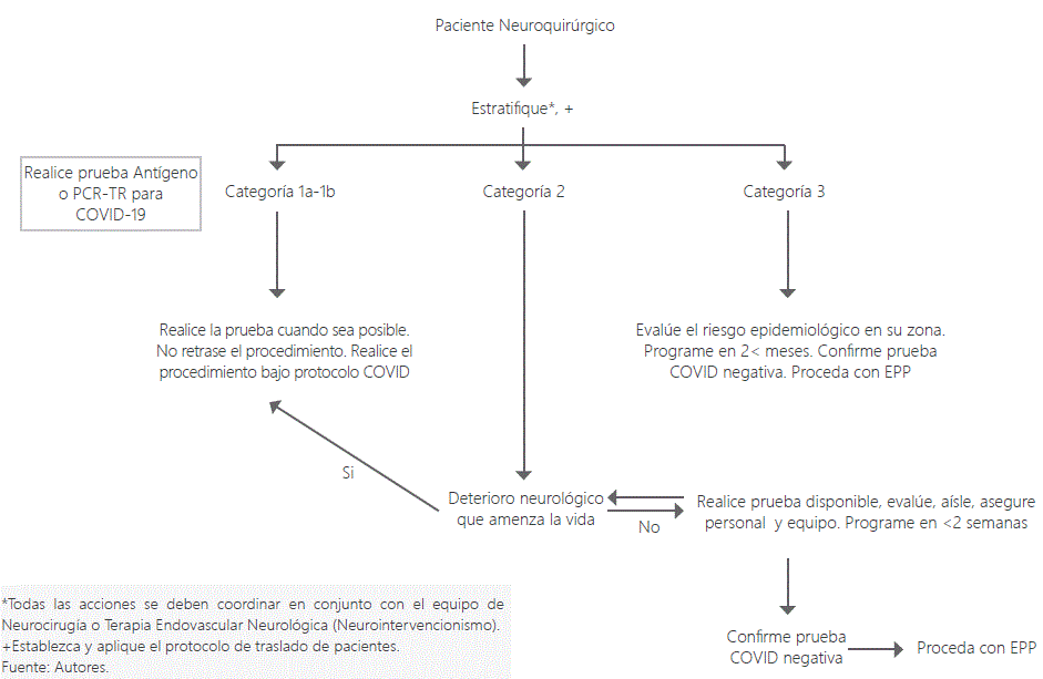 El objetivo de este trabajo es presentar una serie de recomendaciones con base en la evidencia científica actual y la literatura disponible sobre las implicaciones para neuroanestesiólogos y el manejo anestésico perioperatorio del paciente neurocrítico y neuroquirúrgico durante la pandemia por COVID-19. Se propone una guía de estratificación con ejemplos, tiempo máximo y recomendaciones para el procedimiento, así como un algoritmo de apoyo para la programación de estos pacientes (Tabla 1 y Figura 1).
