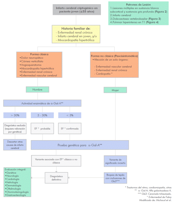 Se recomienda que a todos aquellos pacientes jóvenes (<55años) con antecedente de uno o más eventos de EVC isquémica o hemorrágica, de etiología indeterminada (criptogénica), principalmente aquellos con enfermedades sistémicas (dermatológicas, cardiacas o renales), se les realice tamizaje de Enfermedad de Fabry, mediante la determinación de α-galactosidasa A o secuenciación del gen GLA. El tratamiento de la EVC en estos pacientes es similar a lo establecido en guías clínicas para población general, ya que no existe tratamiento específico para esta patología, pero requiere abordaje 40 y seguimiento multidisciplinario (véase Figura 2 en la siguiente página).