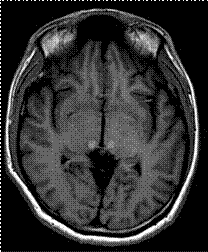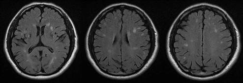 Figura 2 RM T2-FLAIR Axial. Lesiones hiperintensas multiples en sustancias blanca subcortical y sustancia gris profunda bilateral