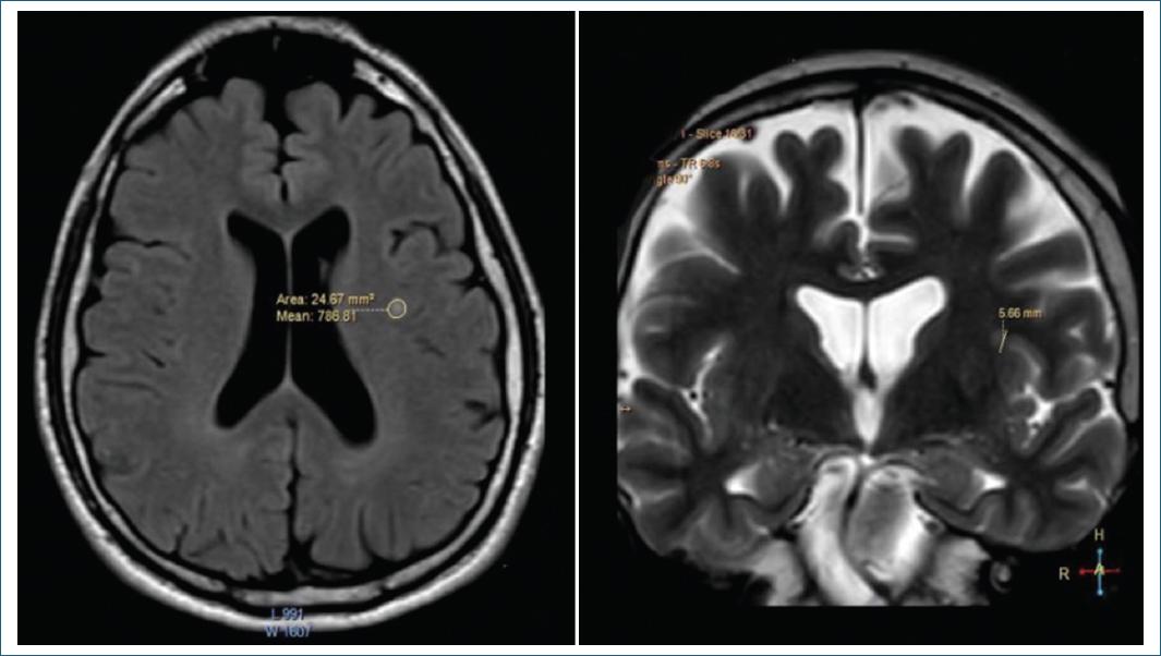 Se observó un infarto lacunar izquierdo aislado y datos de atrofia frontoparietal leve en la imagen por resonancia magnética (IRM) encefálica (Fig. 1).