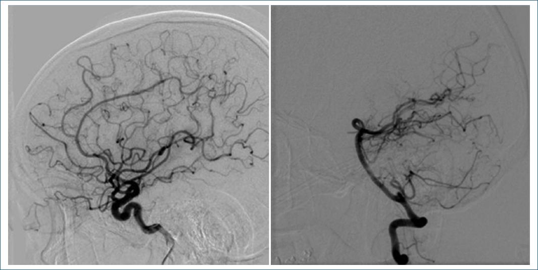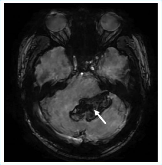 A su ingreso presentaba presión arterial de 110/80 mmHg, 88 lpm y 16 rpm. Al examen neurológico mostraba somnolencia, disartria escándida, dismetría y disdiadocosinesia de las cuatro extremidades, maniobra de Stewart-Holmes presente bilateral y rigidez de nuca; el resto de la exploración sin otros hallazgos patológicos. Se realizó tomografía computarizada (TC) de cráneo que corroboró una HIC involucrando el parénquima cerebeloso con predominio vermiano y en el hemisferio izquierdo, con un volumen estimado de 14 ml. Asimismo, se acompañaba de irrupción al espacio subaracnoideo, condicionando obliteración del IV ventrículo, sin requerir intervención quirúrgica. Durante su estancia se realizaron resonancia magnética (Fig. 1), angio-TC y angiografía diagnóstica por sustracción digital, sin evidencia de anomalía vascular estructural ni de lesiones parenquimatosas que sugirieran alguna causa de la HIC (Fig. 2). A su egreso el paciente persistió con dismetría en el hemicuerpo izquierdo, cuya mejoría sintomática le ha permitido el retorno a su actividad laboral.