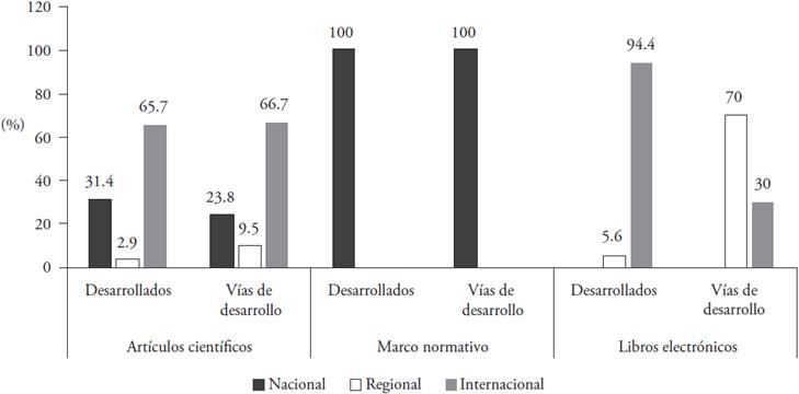 In terms of geographic coverage, the developed countries published more at the international level, while the developing countries did it regionally in the area of electronic books. Concerning the legal framework, both categories only publish at the national level. Likewise, the international coverage of scientific articles stands out in general (Figure 1).