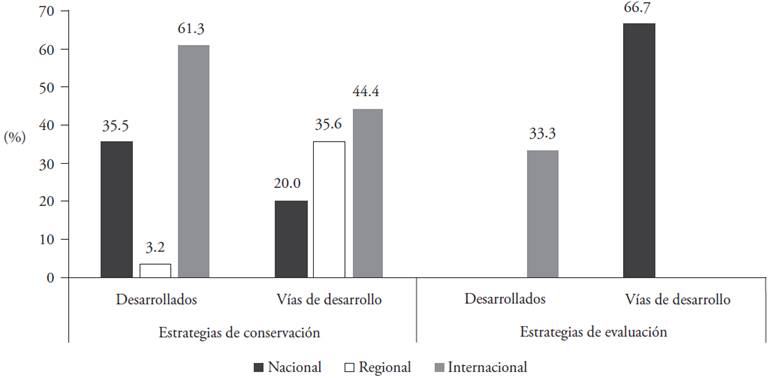 In the developed countries, more was published about conservation strategies at the international and national level. Likewise, in the developing countries the publications referred to the international and regional context. Concerning the evaluation of strategies, in the developed countries they centered around the international scope and in the developing countries in the national scope (Figure 2).